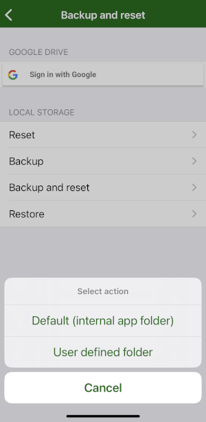 • Choose whether to save the backup to the Default (internal app folder) or a User defined folder