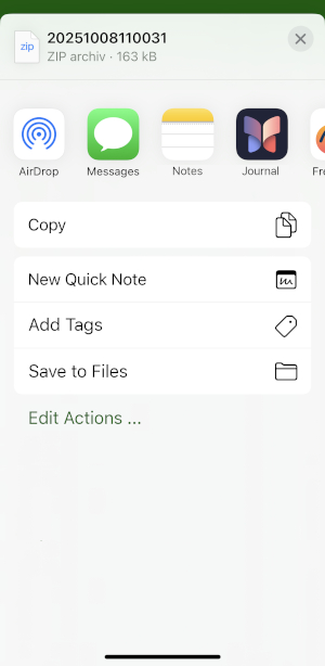 If you select a User defined folder, an action menu will appear showing the generated .zip file. You can then share, copy it, Save it to Files, or send it elsewhere — it’s up to you how to handle the backup file.